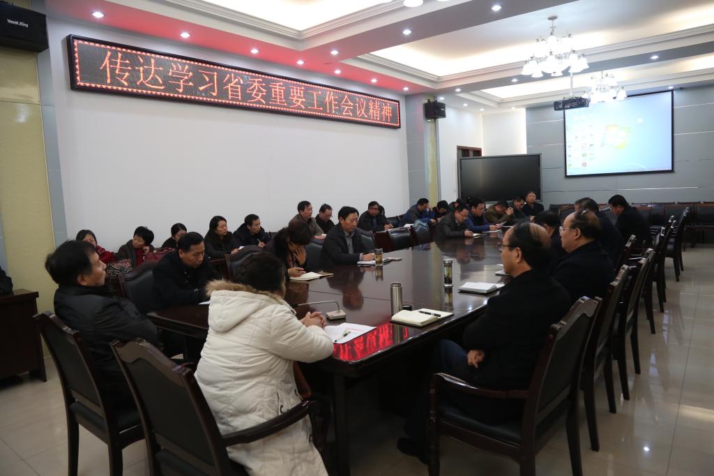 12月29日下午,我校在行政楼第一会议室召开党委中心组扩大会议,传达学习省委重要工作会议精神。校领导、党委中心组成员、党总支书记、行政部门负责人参加了会议。会议由党委书记丁庭选主持。