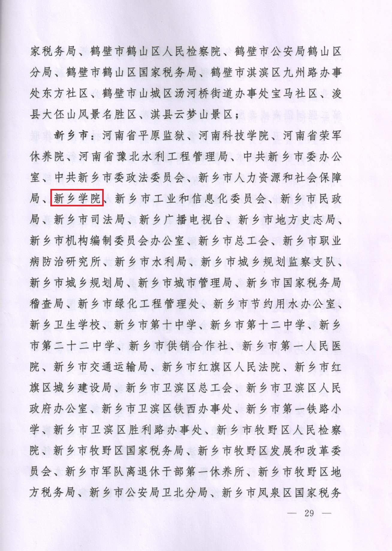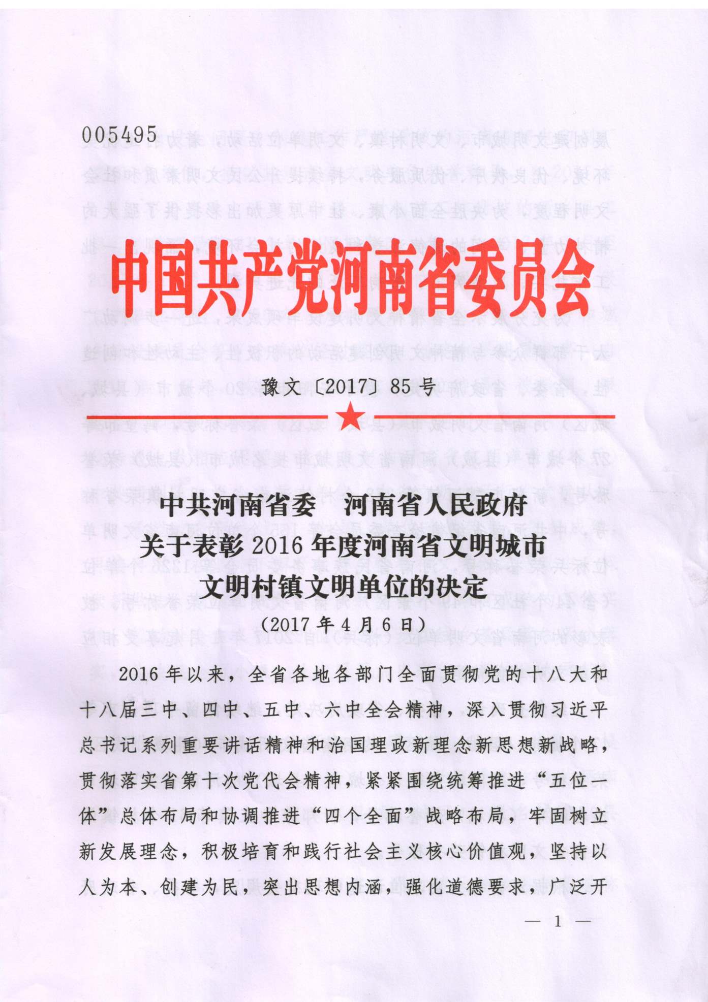 近日,中国共产党河南省委员会下发《中共河南省委河南省人民政府yl6809永利皇宫嘉年华表彰2016年度河南省文明城市文明村镇文明单位的决定》(豫文〔2017〕85号),我校榜上有名,再次获得“省级文明单位”荣誉称号。