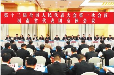 3月5日下午,出席十三届全国人大一次会议的河南代表团举行全体会议,审议政府工作报告。会议由河南代表团团长谢伏瞻主持。国土资源部党组书记、副部长孙绍骋和国务院研究室、国务院办公厅、国家发改委等部门的同志到会听取意见、建议。