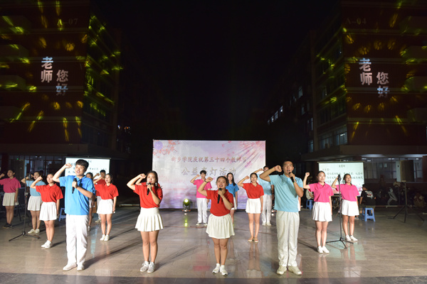 随后,一场精心准备的快闪表演在道德广场隆重举行。在场全体师生首先一起观看了全校各学院、各学生组织的祝福视频,表达了广大学生对老师们诚挚的谢意和尊敬;伴随着音乐学院的歌曲《老师我想你》再一次传递了学生对老师深深的情谊;紧接着,新闻传播学院学生带来散文朗诵《老师,您好》用饱含激情的语言感动了在场的每一位老师;主持人带领全体参演人员及在场学生的集体宣誓则是同学们对老师们默默耕耘、无私奉献的真情回应和致敬誓言。随后,教育科学学院的啦啦操和韩舞社的操舞表演把现场气氛带入了高潮。表演结束后,全体领导老师与参演人员合影留念。