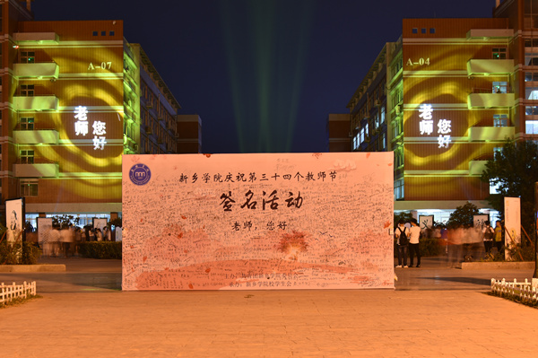 近日,国家教育部明确要求隆重庆祝本届教师节,在全社会营造尊师重教的氛围。我校积极响应教育部号召,策划了完善的亮灯活动方案。晚8点,公益亮灯活动正式开始,学校A04和A07教学东墙上由灯光映出巨幅高亮的“老师,您好”字样,彩灯围绕闪烁,格外炫目。同时,全校所有LED屏上也全部显示“老师,您好”字样,现场节日氛围祥和温馨,情谊浓厚。