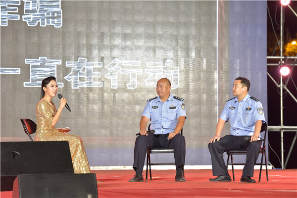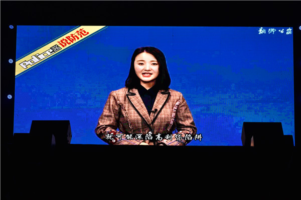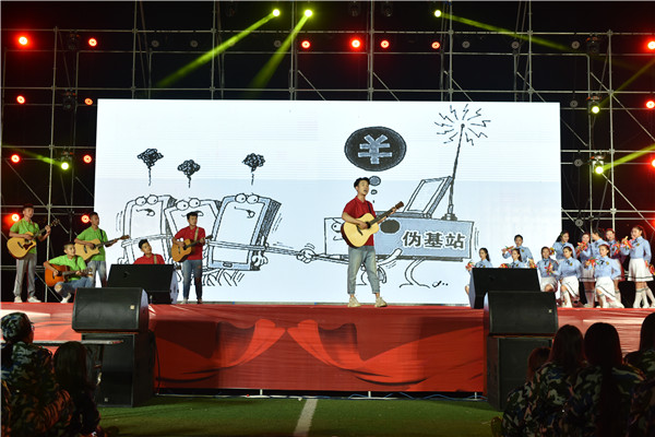 晚7点,晚会拉开序幕。在一段酷炫的灯光秀后,开场舞《奋进的新院人》将现场气氛瞬间点燃,一首《奔跑吧 骄傲的少年》唱出了年轻的激情与活力。小品《快递迷雾》通过角色扮演、警官讲解再现了犯罪分子网络电信诈骗的全过程,教会大家清醒辨别。由校内各社团带来的串烧节目《五彩斑斓》将新院学子丰富的校园生活展现得淋漓尽致。诵读一段经典,品味一段人生,yl6809永利皇宫嘉年华附中学生表演的《诗意中华》经典诵读节目弘扬传统文化,烘托中秋佳节的氛围。音乐学院合唱团的《我喜欢》及《SingSing Sing》歌声悠扬,声声动人。参训教官们带来的战术展示《特种战术》动作行云流水,展示了军人作战时的飒爽英姿。一段古典舞《锦上三月》舞姿曼妙,曲调温婉,散发着独特的东方古典魅力。相声《巨额来电》通过逗趣逗乐的方式向大家展示电信诈骗的形式方法,在幽默中树立大家防诈骗的观念。现代舞《炫·时代》在灯光的配合下,随鼓点而动,获得阵阵掌声。情景诗话《那365双鞋》通过诗意的语言讴歌了乡村教师扎根山区、献身教育的经历。《公安局现场说法》节目由两位警官对各类案件和犯罪行为的条分缕析,为在场万名师生强调了安全的重要性,希望大家提高警惕,严防诈骗。紧接着,一段说唱快板《我是警察》将表演艺术与反诈骗手段有机结合,生动刻画了警察平时工作的形象。一首独唱《中国之中》用嘹亮的歌声描绘出新中国泱泱大国的形象,鼓舞人心。最后,晚会在由音乐学院舞蹈队带来的歌伴舞节目《领航新时代》中落下帷幕。