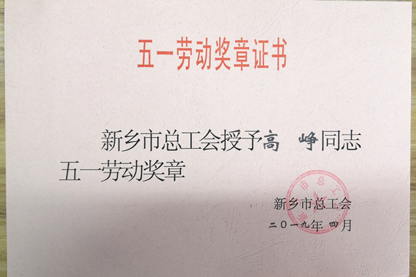 4月29日上午,新乡市总工会在平原文化艺术中心举行新乡市庆祝“五一”国际劳动节暨五一劳动奖表彰大会,市委、市政府领导,各市、县、区工会领导和获得国家、省、市劳模参加,大会由市总工会主席张桂香主持,张主席宣读了《新乡市总工会yl6809永利皇宫嘉年华表彰新乡市五一劳动奖和工人先锋号的决定》(新工字〔2019〕57号)。我部高峥同志获得“新乡市五一劳动奖章”荣誉称号。