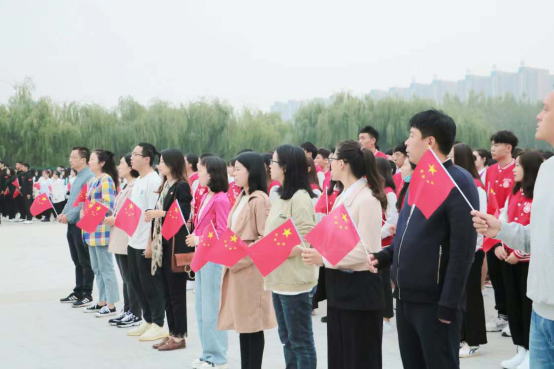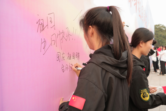 此后,悠扬的音乐响起,大家挥舞手中的国旗齐唱《我和我的祖国》,并依次至主题行架前书写对祖国的祝福。
