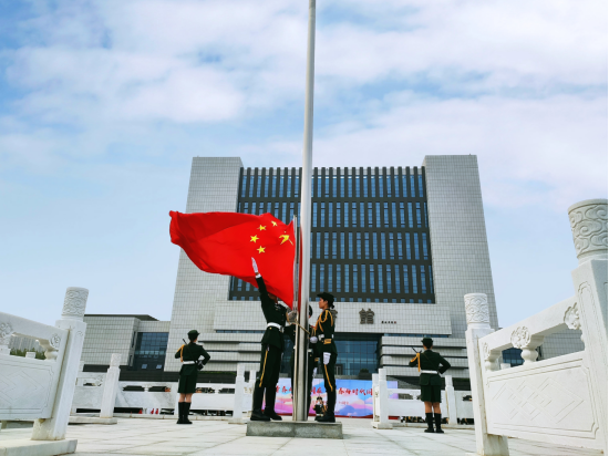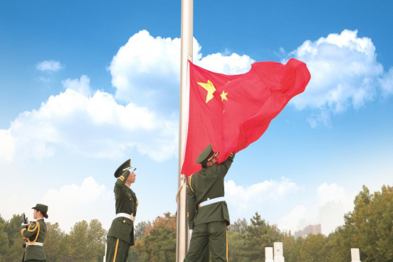 6点50分,伴随着响亮的口号、坚定的步伐,装备整齐的校国旗护卫队一行护卫国旗入场。随后,雄壮的国歌响起,鲜艳的五星红旗在广场冉冉升起,全场行注目礼并齐唱国歌。