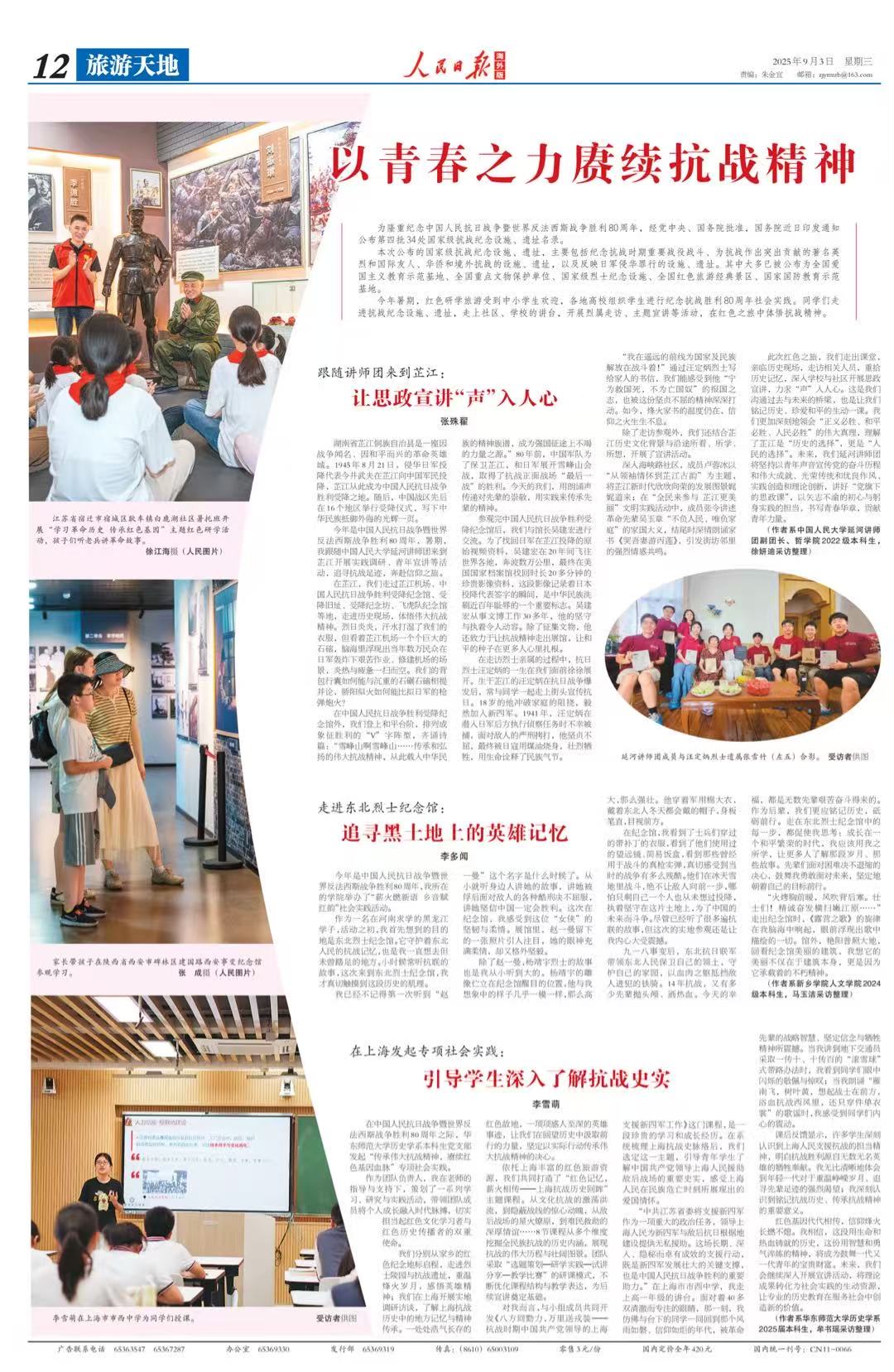 《人民日报(海外版)》2025年9月3日12版刊发人文学院“薪火燃新语 乡音赋红韵”社会实践团队成果,在特殊的日子里,听2024级李多闻同学讲述东北人民的抗战记忆。