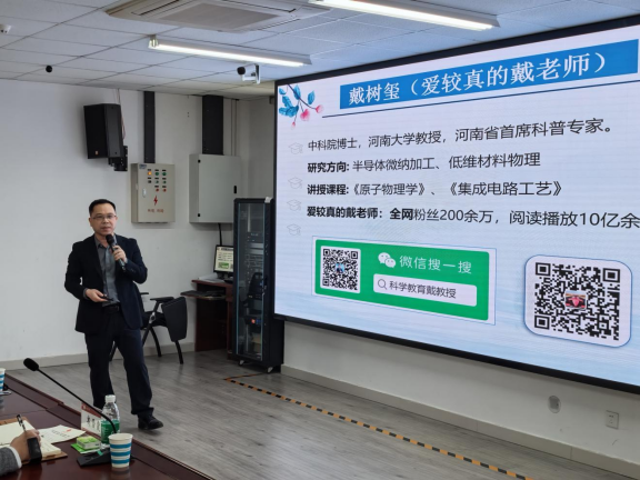 活动特邀河南大学戴树玺教授作专题报告,报告题目为《在量子和青春之间:科学与浪漫的二重奏》。戴树玺是河南省首席科普专家,2022年获“典赞•科普中原”年度科普人物,2023获“感动中原”年度教育人物。戴教授结合自身丰富的科普实践经验,深入探讨了如何利用短视频构建高校特色科学素养教育模式,为科普工作提供了创新思路。此外,他还就“科普工作如何促进教师的教学科研”“如何激励学生参与科普”等问题与现场师生展开交流。